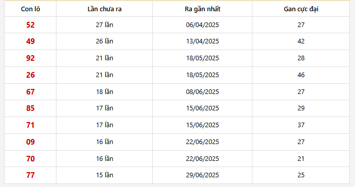 - Con 52 đang ở mức cao nhất, với 27 kỳ liên tiếp chưa xuất hiện, lần gần nhất ra vào ngày 06/04/2025. Đây cũng là mức gan cực đại 27, cho thấy nó đang tiệm cận hoặc đạt ngưỡng cao nhất từng ghi nhận.